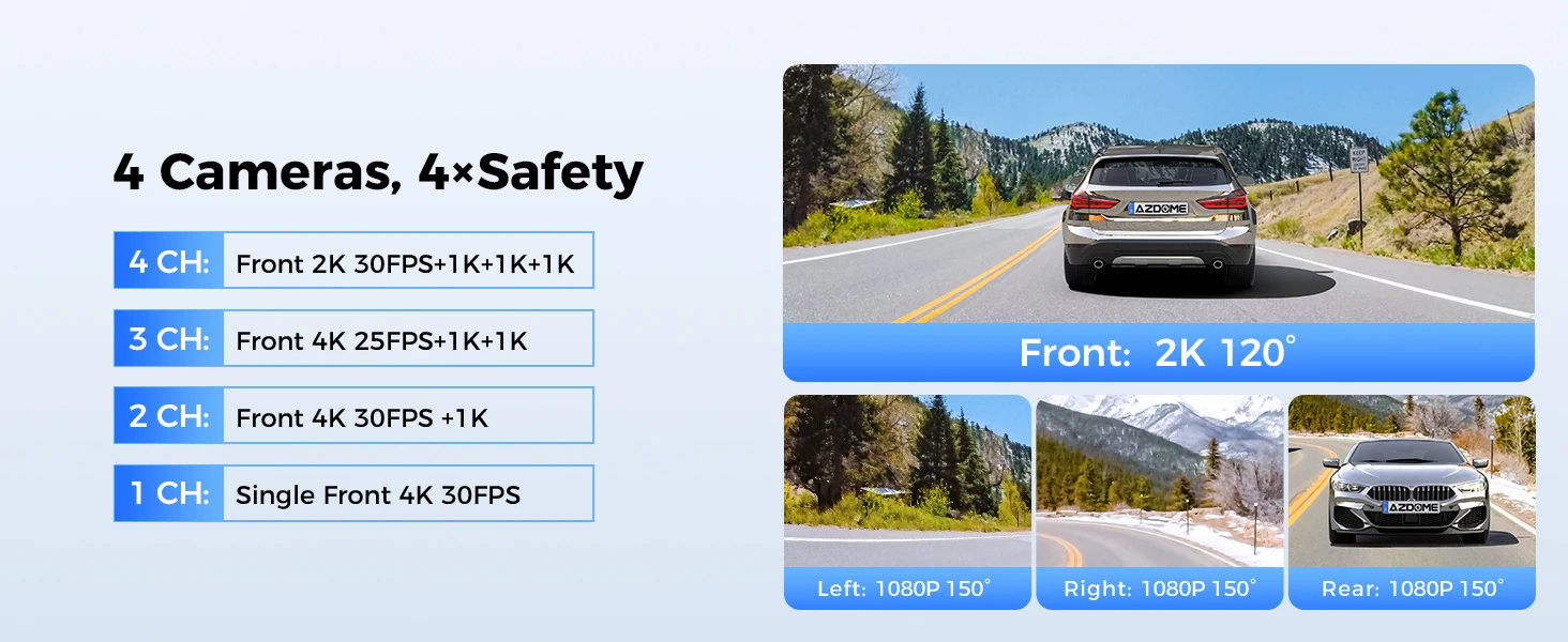 The M660 dashcam is the first four-channel dashcam that can record front, left, right and rear 2K+1080P+1080P+1080P simultaneously and provides 360-degree all-round protection.