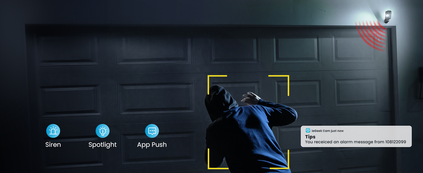 🎁PIR Motion Detection & Siren Spotlight Alarm: ieGeek battery camera is equipped with PIR motion sensor and advanced AI algorithm, which significantly enhance humanoid identification and reduce false alarms. The siren and spotlight will turn on to warn potential intruder as soon as movement is detected at night. When camera detect movement, it start to record and send real-time notifications to your phone, reminding you to check suspicious activity in time.